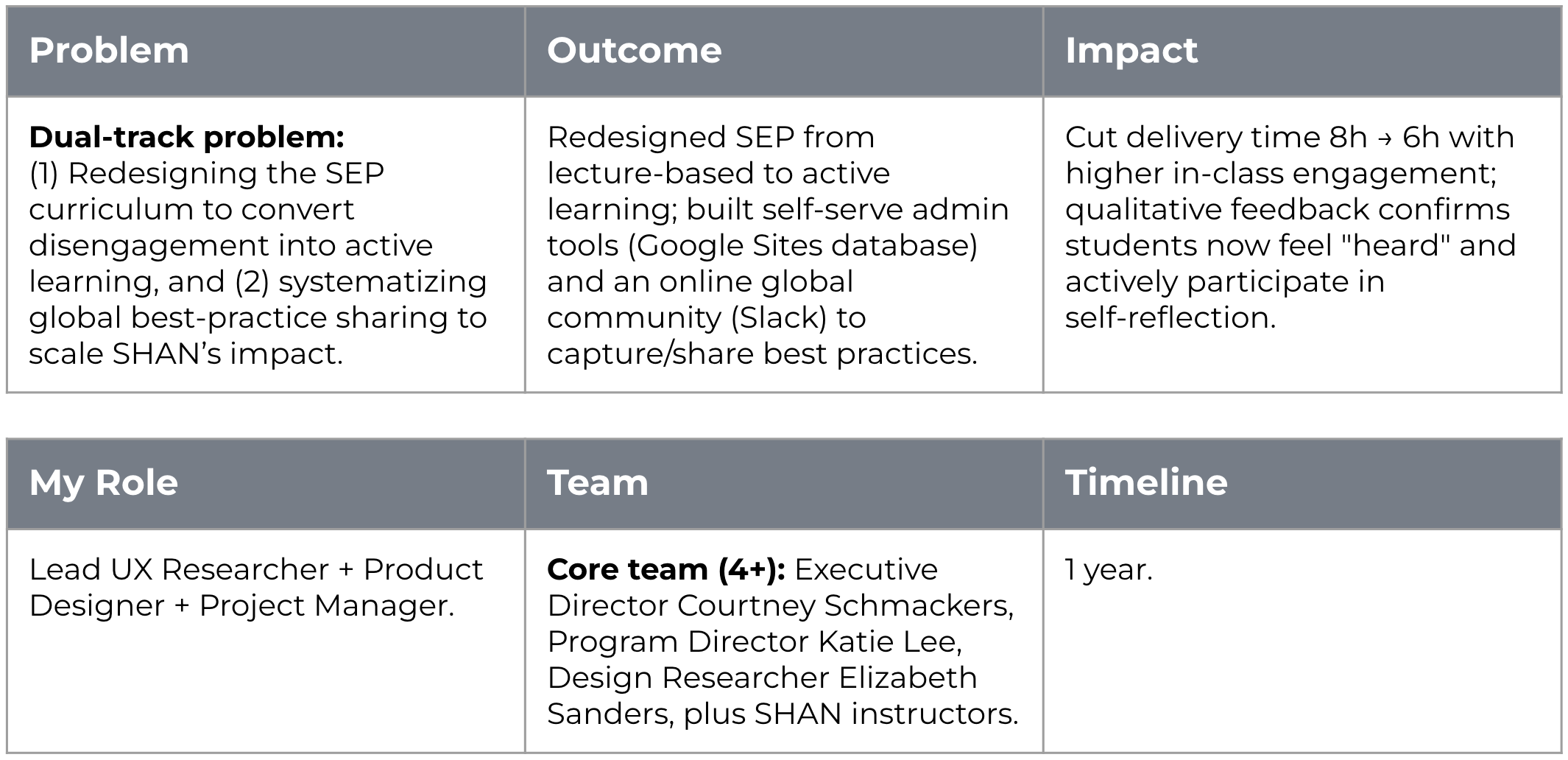 This project for the nonprofit She Has A Name (SHAN) demonstrates advanced problem-solving by navigating the “Fuzzy Front End” of complex social issues. Rather than simply designing an interface, this initiative involved redesigning a trauma-informed educational curriculum and establishing a global administrative infrastructure to ensure long-term operational sustainability and demand reduction.